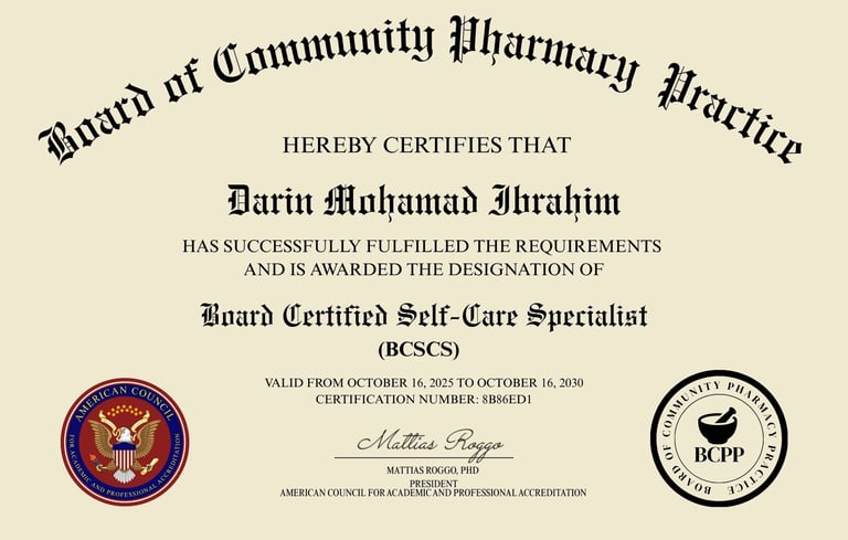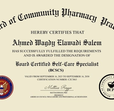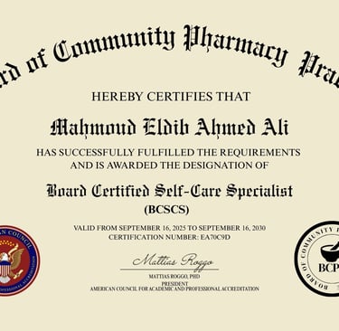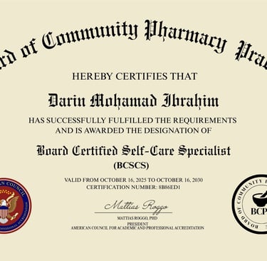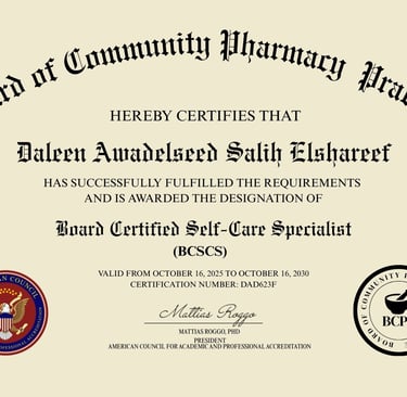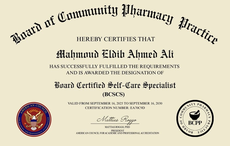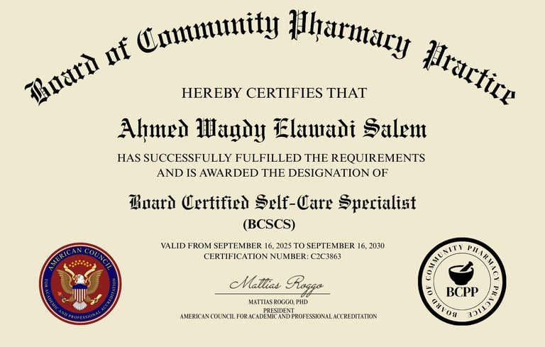 والشهادة اللي أنا خدتها هي: Board Certified Self-Care Specialist (BCSCS)